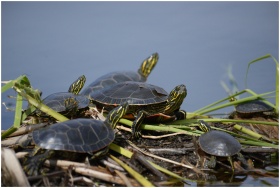 A close-up of painted turtles basking in sunlight near a water body, emphasizing their vibrant shell patterns.