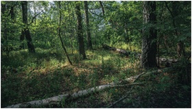 Tranquil forest scene with sunlight filtering through lush summer greenery.