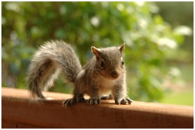 Adorable squirrel perched on a wooden railing, outdoors with natural green background.