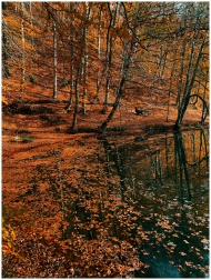 A tranquil autumn scene with orange leaves reflecting on a calm lake.