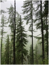 Serene view of a misty evergreen forest with tall conifers and fog.