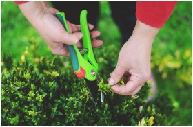 Hands using pruning shears to trim greenery in a g