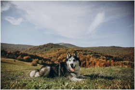 A Siberian Husky lies on grassy field with scenic autumn mountains in the backdrop.