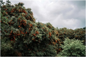 A vibrant rowanberry orchard filled with lush, fruit-bearing trees under an overcast sky.