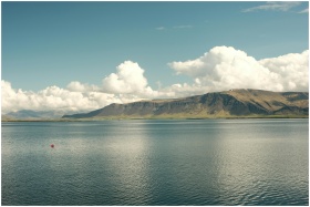 Breathtaking view of Mount Esja with clouds over ocean in Reykjavík, Iceland.