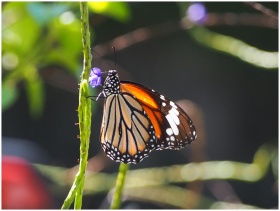 Beautiful close-up of a Danaus genutia butterfly resting on a flower in natural light.