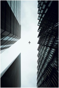 A dramatic view of an airplane flying above modern