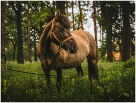 A brown horse with a bridle grazing amidst lush greenery in a serene forest setting.