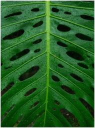 Vivid green Monstera leaf with raindrops, showcasing natural beauty in Colombia's lush environment.