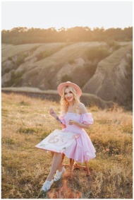 Blonde woman in a pink dress painting outdoors in a rural meadow during sunset.