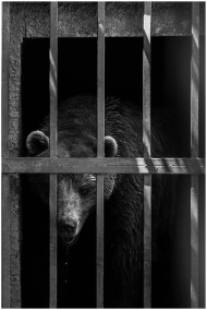 A somber black and white portrait of a brown bear behind cage bars in Montenegro.