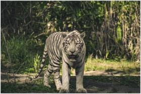 White Bengal Tiger prowling in lush green forest, captured in natural daylight.