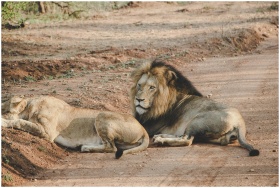 A pair of lions resting on a dirt road during a South African safari, showcasing wildlife in its natural habitat.