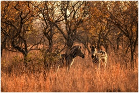 A pair of zebras roam through a sunlit savanna during fall, surrounded by lush trees and tall grass.