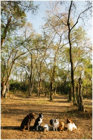 Full length cute dogs of different breeds sitting together in verdant woodland on sunny day