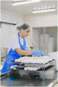 Woman worker in cheese production line at dairy fa