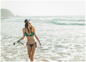 A young woman smiles while holding snorkel gear on