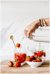 A hand pouring water into glasses with strawberrie