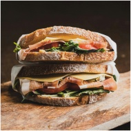 Close-up of a gourmet sandwich with prosciutto, cheese, and greens on a wooden board.