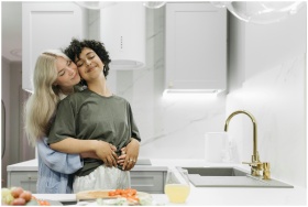 Happy couple embracing in contemporary kitchen, sh