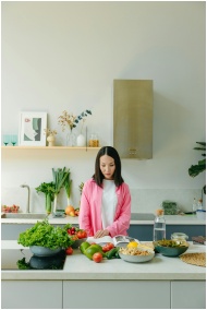 Asian woman reading recipe and preparing a healthy meal with fresh vegetables in a modern kitchen.
