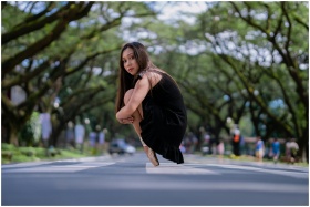 Elegant ballerina in black dress posing on a scenic tree-lined road capturing a fusion of dance and nature.