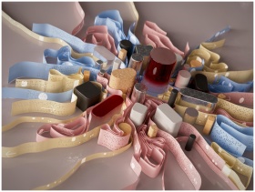 Artistic arrangement of ribbons and containers in various colors and shapes.