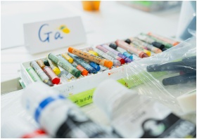 Brightly colored pastels and art supplies in a cre