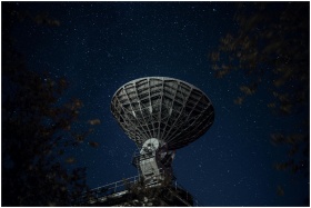 Silhouette of a satellite dish against a starry ni