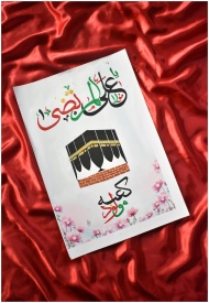 Vibrant Islamic poster featuring Kaaba illustration on a red fabric backdrop.
