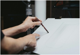 Close-up of hands sketching a cylinder on paper in a Shinjuku art studio.