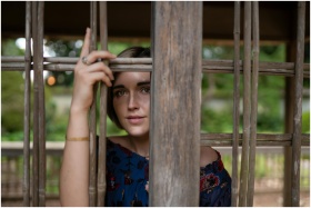 Young woman with short hair relaxes behind a rustic wooden fence in a peaceful outdoor setting.