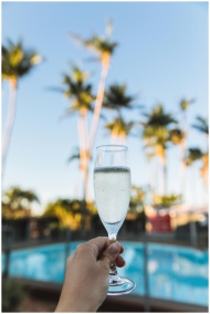 Close-up of a hand holding a champagne glass with a tropical poolside view.