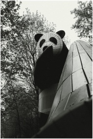 A towering panda statue amidst trees in a Moscow park, captured in black and white.