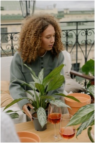 Woman with curly hair gardening on a rooftop terra