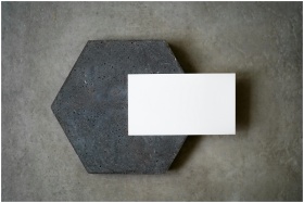 A blank white card placed on a textured concrete hexagon for a minimalist design.