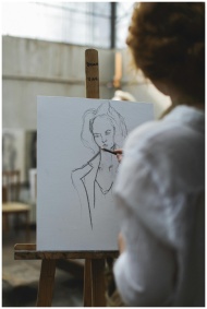 Artist sketching a portrait on canvas in an art st