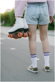 A person in denim shorts and pink jacket holding roller skates on a street.