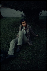 Young woman in a plaid jacket sitting on grass at night in a peaceful setting.