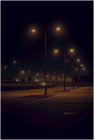 A moody, dimly lit street scene with rows of glowing lamp posts at night.