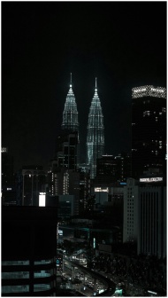 Stunning night skyline featuring the illuminated Petronas Towers in Kuala Lumpur, Malaysia.