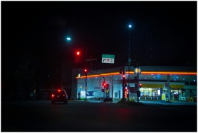 A gas station on a quiet street in Buenos Aires at night with traffic lights and a car parked under vibrant lights.