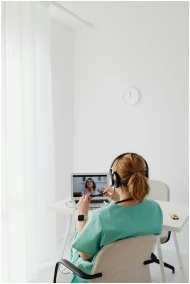 A healthcare professional in scrubs having a video