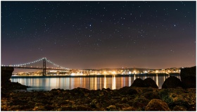 Captivating night scene of Lisbon with a starry sky above the illuminated suspension bridge.
