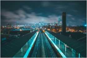 Stunning cityscape at night with illuminated skyscrapers and railway tracks leading into the city.
