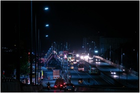 Dramatic night view of a busy highway bridge with moving traffic in India.