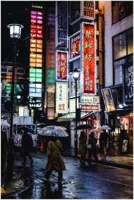 Vibrant street scene in Japan with people walking under umbrellas on a rainy night.