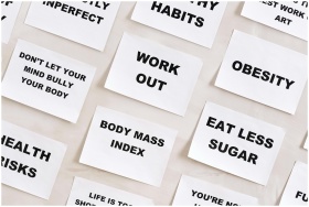 Flat lay of motivational health quotes on paper, p