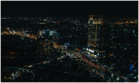 Stunning aerial view of Ho Chi Minh City with illuminated skyscrapers and bustling streets at night.