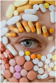 Artistic close-up of a human eye adorned with assorted colorful pills, highlighting modern healthcare themes.